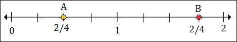 To plot $\frac{1}{2}$ or $\frac{2}{4}$ we put a point between 0 and 1, 2 marks to the right of 0.