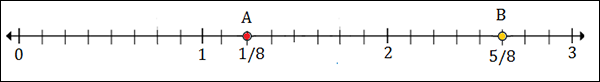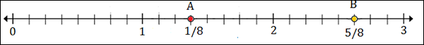 To plot 2$\frac{5}{8}$, we put a point between 2 and 3; 5 marks to the right of 2.
