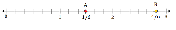 To plot 1$\frac{1}{2}$ or 1$\frac{3}{6}$, we put a point between 1 and 2; 3 marks to the right of 1.