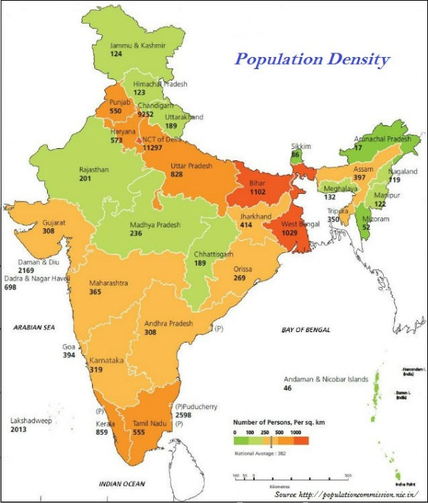 Bihar with 1102 people per square km is the most densely populated state of India followed by West Bengal (1029) and Uttar Pradesh (828).