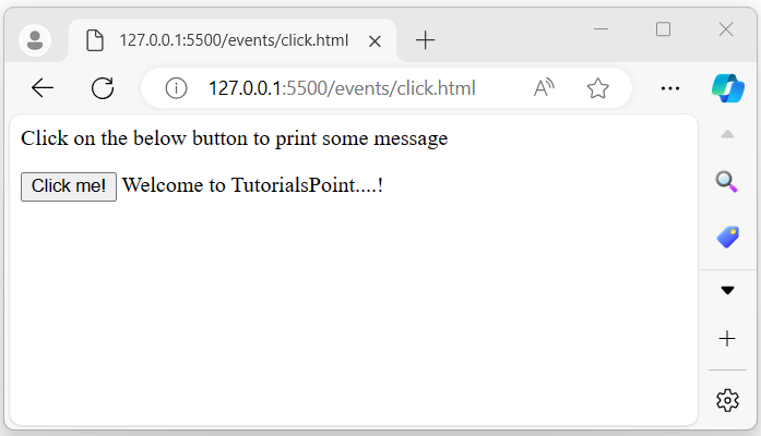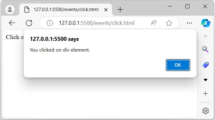 In the above program, when the user clicks on the displayed message, a pop-up alert will appear on the browser screen −