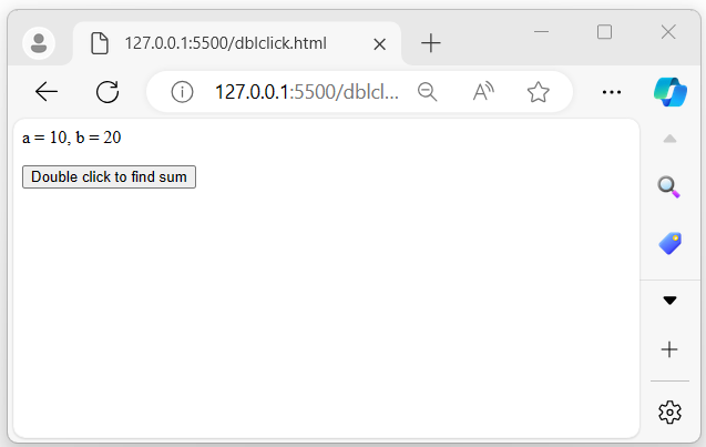 After executing the program, it displays two variables, a and b, with respective values of 10 and 20. When the user double-clicks on the button, the sum of these variables will be displayed −