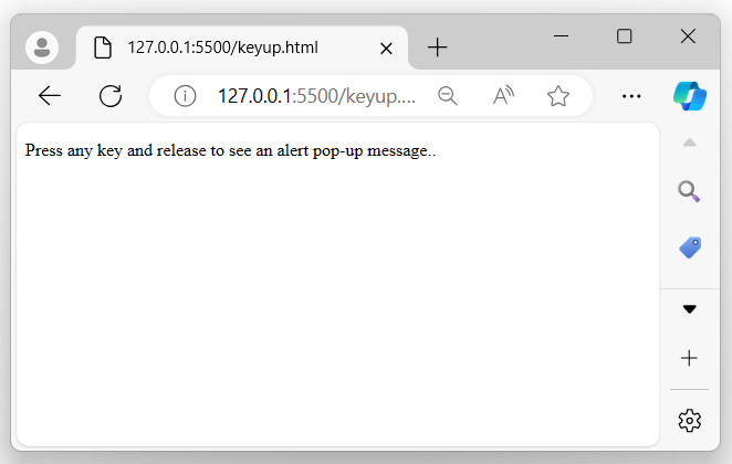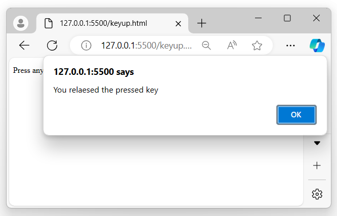 The above program displays a message when the user presses any key and releases an alert pop-up message will be appear on your browser screen −