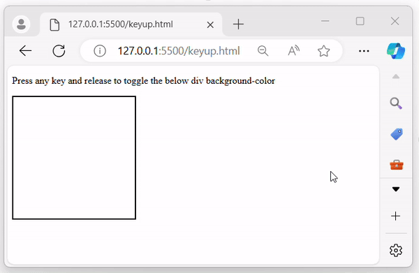 Once the above program is executed, a box will be displayed with black border. Whenever the user presses and releases any key, the background color of the displayed box will change each time −