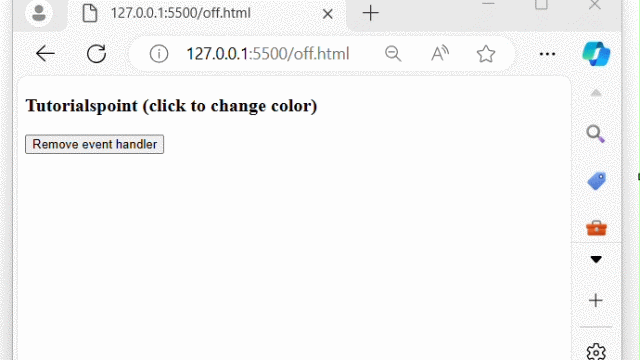After executing the program, a p element and a button are displayed. When a user clicks on the p element its color change to green, and when the button is clicked the event handler will be removed from the "p" element −