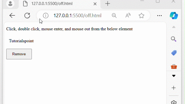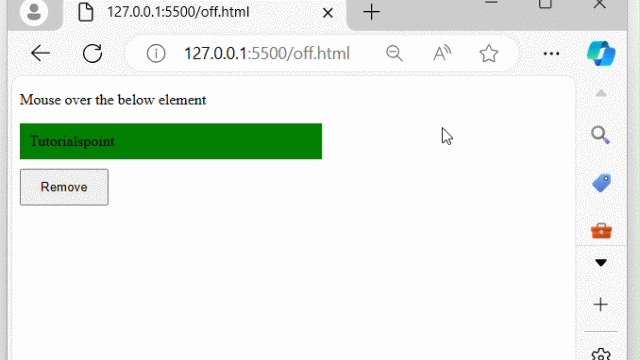 Once the above program is executed, a box (represented by a div element) and a button are displayed. When the mouse pointer hovers over the div, a pop-up alert appears on the browser screen. When the button is clicked it removes the specific event handler from the div −