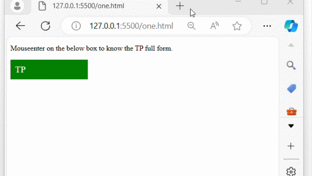 Once the above program is executed, a <div> element is displayed with the text "TP". When the mouse pointer enters the 'div' element, the full form of "TP" will be displayed within the same <div> element −