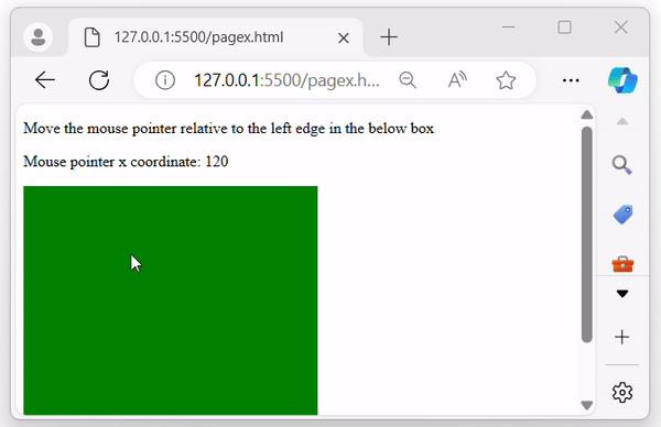 Following is another example of using the jQuery event.pageX property. We use this property to find the X-coordinates of mouse pointer for a specific area −