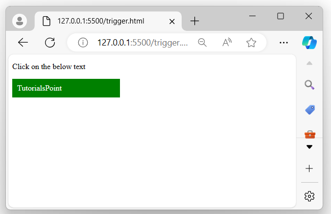The above program displays a message, and when the user clicks on it, a click event is triggered, and a pop-up alert appears on the browser screen −