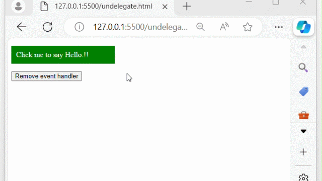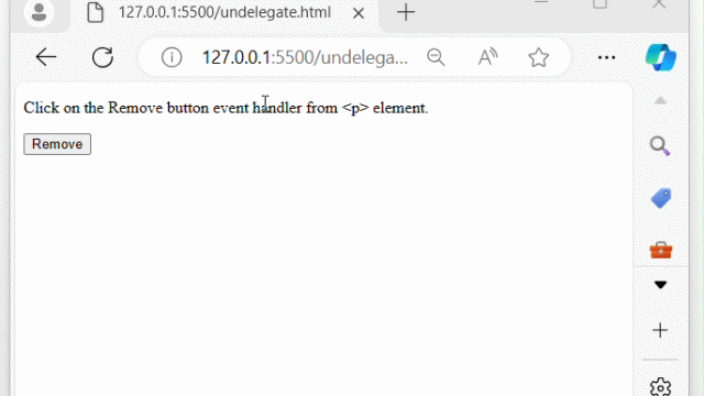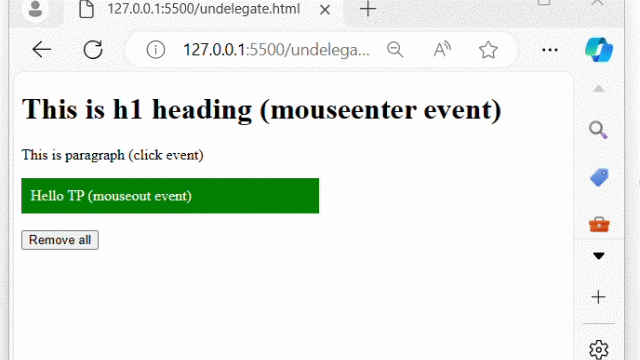 After executing the above program, an <h1>, <p>, <div>, and a button element will be displayed. We have added an event handler to these elements (except the button) using the delegate() method. When the button is clicked, all event handlers will be removed −