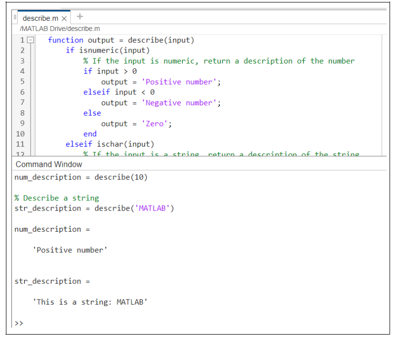 Now, let's create a function called describe that provides different outputs depending on whether the input is a numeric value or a string.