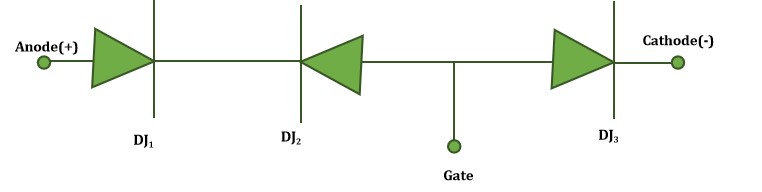 A thyristor has three PN junctions J1, J2, J3. Each PN junction is represented by diodes. When thyristor is forward biased and junctions J1 and J3 are forward biased and junction J3 is reverse biased.