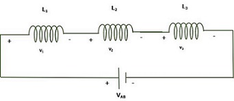 Here, the three inductors of inductance L1, L2 and L3 are connected in series. The current across the inductors are same, then by applying the kirchoff voltage law, the voltage drop is the sum of the voltage drop across each inductor −