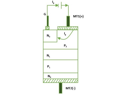when gate terminal is negative with respect to MT1, gate current flows through P2N3 junction, and reverse biased junction N1P2 is forward biased as in a normal thyristor. As a result, triac starts conducting through P1N1P2N3 layers initially.