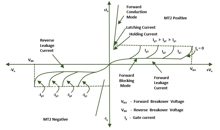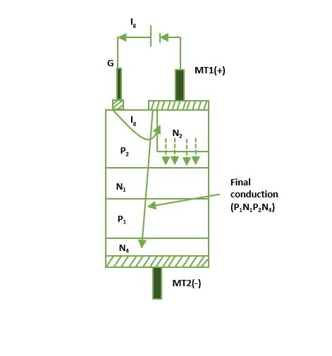 When MT2 is positive with respect to MT1, junction P1N1, P2N2 are forward biased but junction N1P2 is reverse biased. When gate terminal is positive with respect to MT1, gate current flows mainly through P2N2 junction.