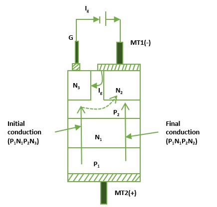 In this mode, N3 acts as a remote gate. The gate current Igflows from P2 to N3 as in a normal thyristor. Reverse-biased junction N1 P1 is broken and finally, the structure P2 N1 P1 N4 is turned on completely.