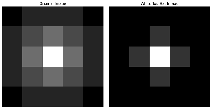 The white top hat of an image is defined as the difference between the original image and its morphological opening (white top hat = image - opening). In other words, it reveals the bright regions of the image that are smaller than the provided footprint.