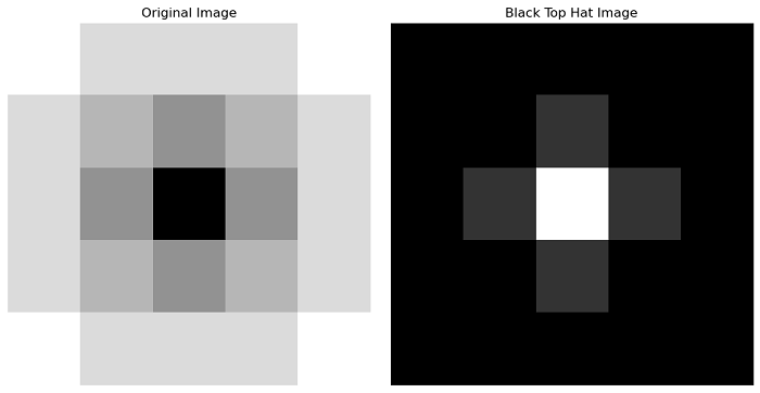 Whereas the black top hat operation is defined as the difference between the morphological closing of an image and the original image (black hat = closing - image). It highlights the dark spots in the image that are smaller than the specified footprint. Dark spots in the original image are converted to bright spots after performing the black tophat operation.