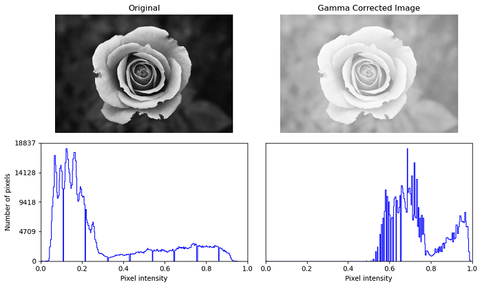 The following example demonstrates how gamma correction affects the appearance and pixel intensity distribution of an image. The original and gamma-corrected images, along with their histograms, are displayed side by side for visual comparison.
