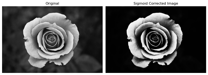 The function skimage.exposure.adjust_sigmoid(image, cutoff=0.5, gain=10, inv=False) performs Sigmoid Correction on an input image. Sigmoid correction is also known as Contrast Adjustment. This correction transforms each pixel in the input image using the following equation: