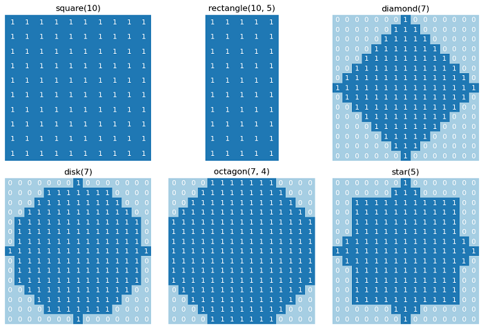 from skimage.morphology import (square, rectangle, diamond, disk, octagon, star)