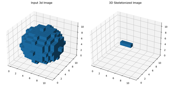The following example demonstrates skeletonization of a 3D structure(binary array) using skeletonize_3d() function.